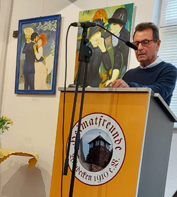 Keim’s Schwiegersohn, Bernd Zeller, gab stellvertretend für die Familie Einblicke über den beruflichen Werdegang von Fritz Keim, zur Familie, seinen Ehrenämtern und zu seinen Hobbys, denn er hatte einige. Im Vorfeld hatte Wolfgang Interwies, Museums- und Gewölbewart, alle Bilder im gesamten Museumscafe mit Unterstützung seiner Frau und der 1. Vorsitzenden aufgehängt und diese mit Hinweisen auf den Maler mit Gemäldetitel versehen.