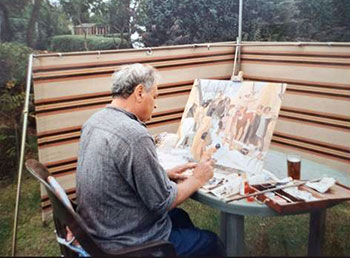 (Fitz Keim vor der Staffelei im Garten seines Hauses)