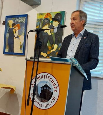 Keim’s Schwiegersohn, Bernd Zeller, gab stellvertretend für die Familie Einblicke über den beruflichen Werdegang von Fritz Keim, zur Familie, seinen Ehrenämtern und zu seinen Hobbys, denn er hatte einige. Im Vorfeld hatte Wolfgang Interwies, Museums- und Gewölbewart, alle Bilder im gesamten Museumscafe mit Unterstützung seiner Frau und der 1. Vorsitzenden aufgehängt und diese mit Hinweisen auf den Maler mit Gemäldetitel versehen.